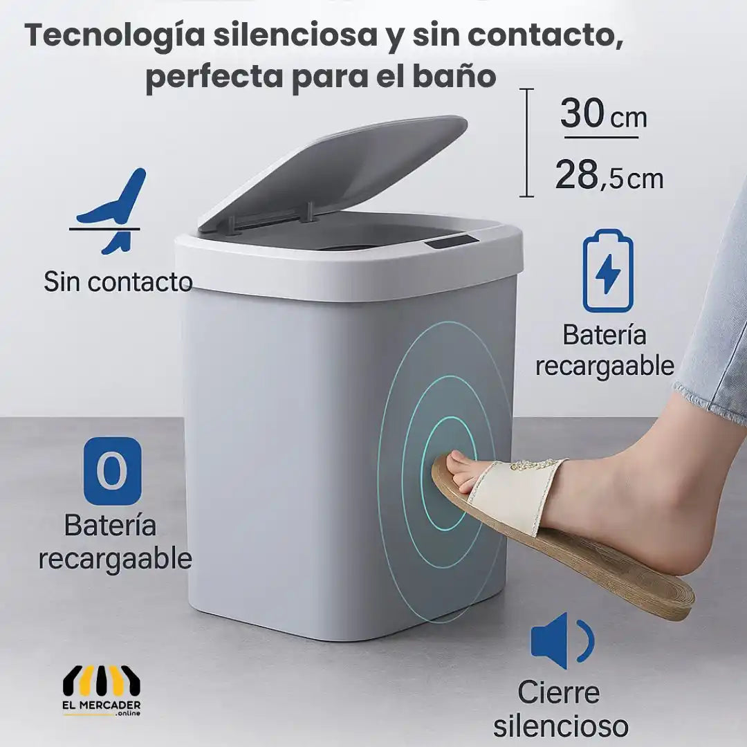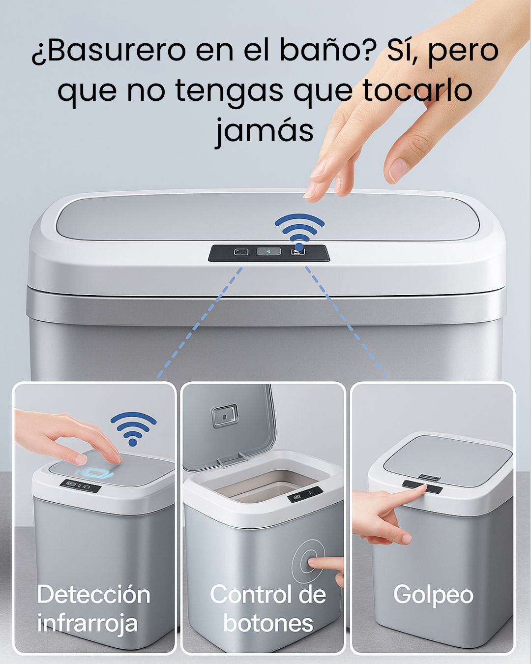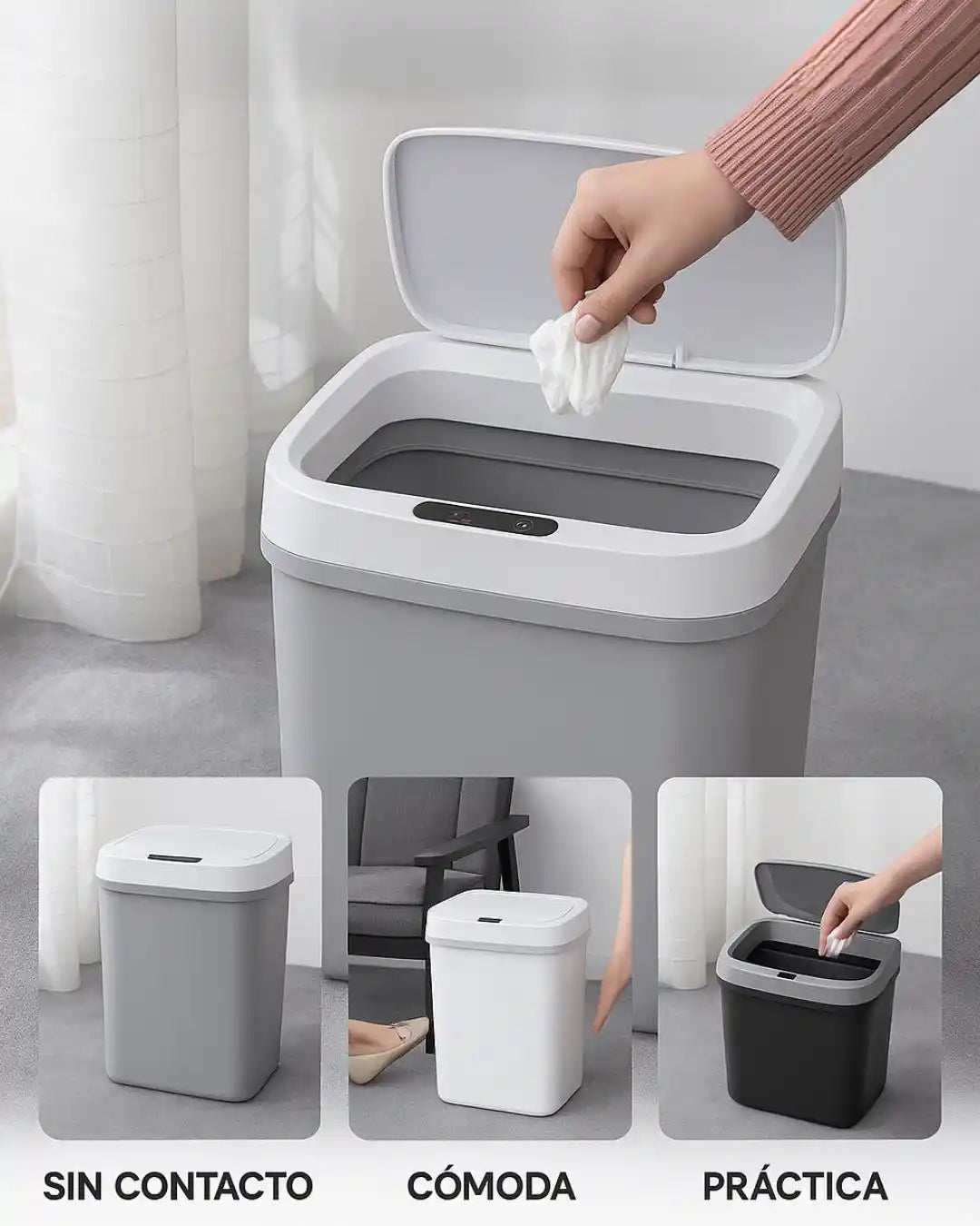 La papelera cuenta con un sensor infrarrojo que detecta el movimiento y abre la tapa en 0.1 segundos, evitando el contacto directo con la basura.